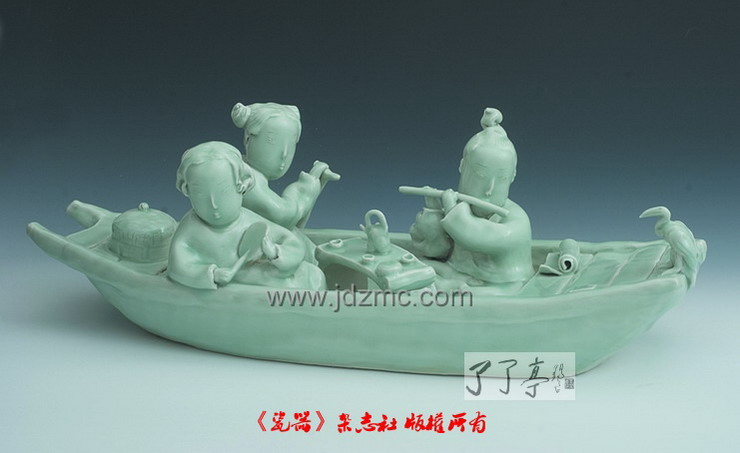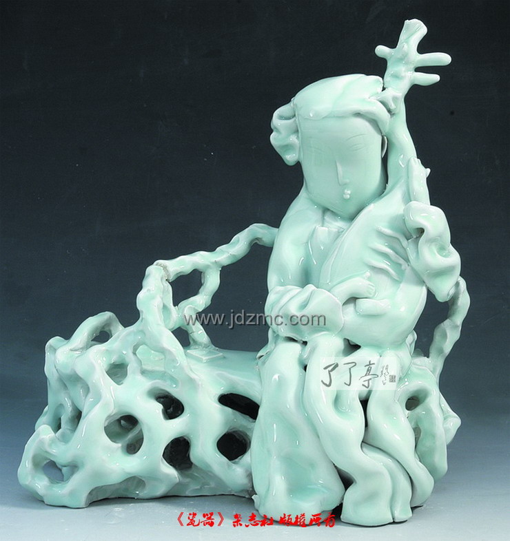 打开黄胜画册,或是流连于创作室展厅,我们不难发现,无论是他的仕女雕塑《清商初起》、《采莲曲》、《春游》,还是他的山水作品《观云》《溪山闲步》《听泉》,无不是施以温润典雅的影青色釉,这就是陶瓷素语所说的青瓷。