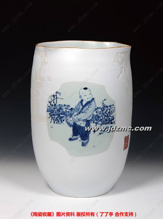 一件作品,打破欣赏界限,仅仅让人们觉得“好”是不够的。见过吕金泉教授拉坯的人都知道,他让手下的坯体成了心理寄托,器型各部分的比例关系、器型的线条等都在他内心细微感觉支配下完成,整个形体微妙地偏离周正、完整的规范,模样清新别致含蓄蕴藉,耐人咀嚼回味。比如以童子为主题不同形貌的盖罐,像《闲情童子》、《天真》、《快乐年华》、《金色年华》、《童·禅》等等,个个贴近日常生活,尽显童子纯真性情,通体高雅、清净,富含诗意。笔者欣赏之余,想到一个问题: