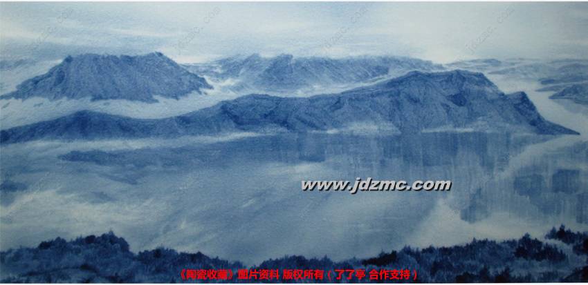 赵传玉水墨青花在题材上更多地选择了山水,取山水之大气磅礴之势,更便于水料恣肆率意、纵横开阖地铺陈与展开。水天一色,茫茫苍苍,非水墨青花所不能现其效果。赵传玉的水墨青花山水画类型多样,有风云氤氲、随心抽象之写意,有重峦叠嶂、山势回转之壮景,亦有庄舍掩映、水波潋滟之小景,不一而足,体现了赵传玉只争朝夕的旺盛创作力,具有厚积而薄发、一发而不可收的豪气。