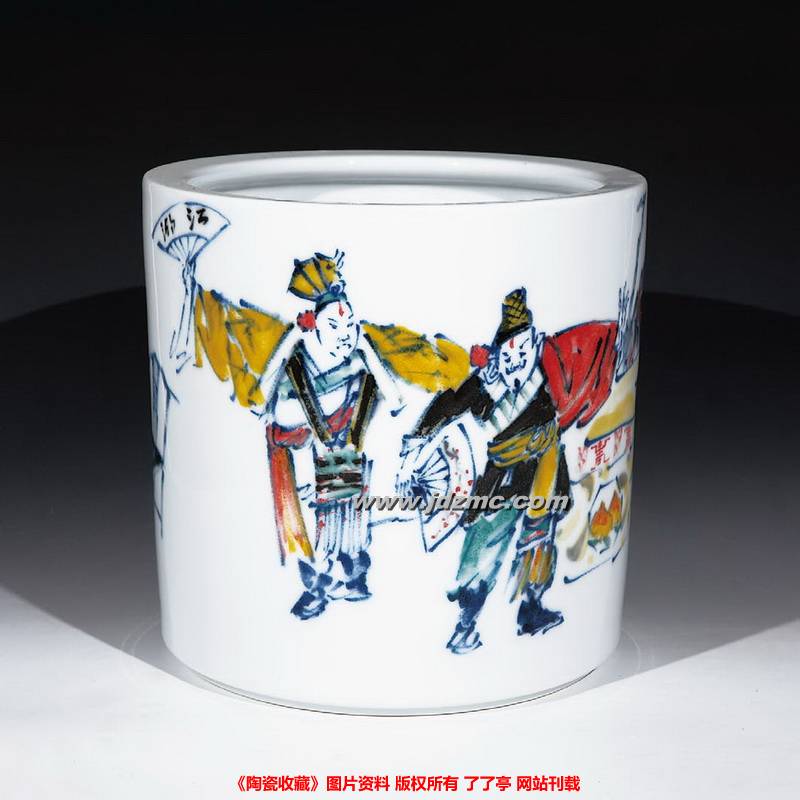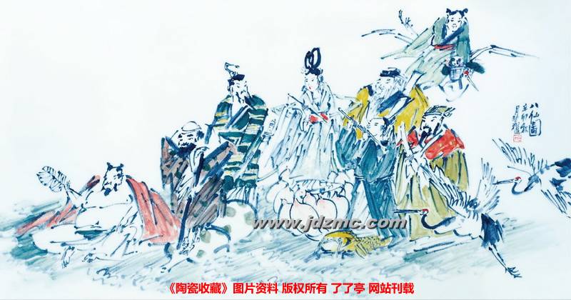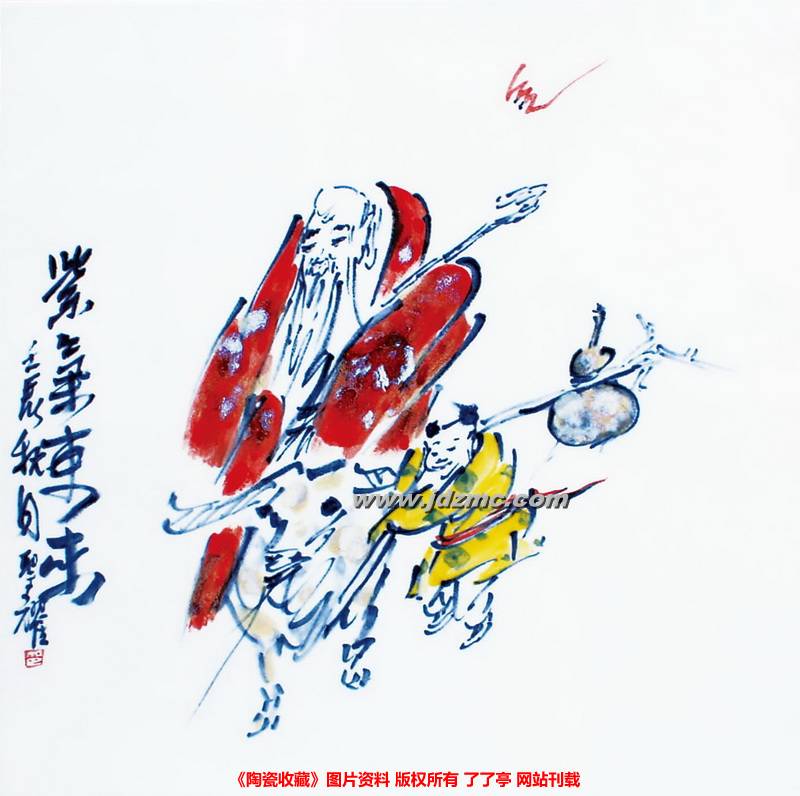 与唐老师的谈话加深了我对他作品的理解。飘逸洒脱的用笔,富有节奏感的线条而让笔下的人物有情又有神,颇有南宋梁楷的画风而又不同于梁楷。《得鳜图》用笔草草,如不经意间而脱纵横之习,把渔夫得鳜而归的喜悦之情和潇洒自在的心态描绘得淋漓尽致,似乎身边已拂起了惬意的晚风还有晚霞映着那粼粼的水波,让观画者有身临其境的感觉。《雅集图》系列用源自国画而又有现代构成意味的构图,挥洒自如的用笔,氤氲自然而气韵生动的墨色描绘了高山流水遇知音的人生喜悦。最喜欢的还是《明月松间照》,单纯的墨色,用笔缓与急、文与质、收与放的结合营造出了一种空旷高古的境界,月色的皎洁与贤士的高洁交相辉映,隐现出一种“万物并作,吾以观复”的大自在境,实为初看平平而终见妙境。黄宾虹曾说“ 太极图是书画秘诀”。太极图乃变化无穷、生生不息之图,从视觉上直接阐释了万物对立统一的哲学思想。唐圣耀作品用笔轻松自然,虚实相间,以形写神,自写性灵,不求悦于人,即老子所谓“知希为贵”之旨。在抒发自我情感的同时也抒发了中华民族的传统情感。在物质文明日益丰富的今天,在人们生活节奏日益加快的今天,在整个浮躁的社会大背景下,追求精神生活的充实势必是现代人的一种需求回归。陶瓷艺术品已逐渐被人们认识和了解,唐圣耀作品中显现出来的洒脱自由以及情感的纯粹势必会成为现代人的一块精神栖息地。