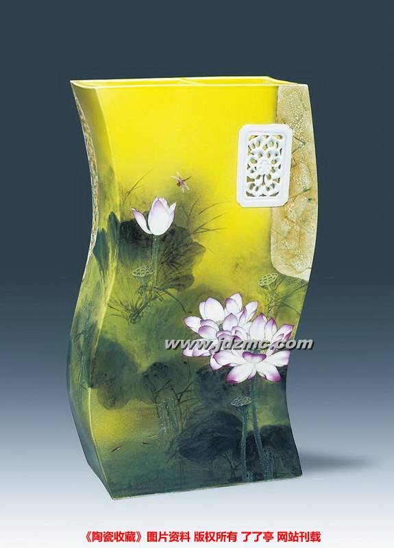 落款黄萍。不知是什么样的女子。因心生仰慕,想着定要认识一下。过了几日,我们终于约在大师汇学正瓷艺馆见面,那里是她作品陈列和品茗会友之所。利落的短发,笑容极美,透着优雅和知性,田园风格的碎花裙却带给她如同小女孩般的朝气。流转的空间里一件件作品在灯光下极其华丽,一切如同料想,摆在眼前的作品实物比图片给了我更大的震撼。