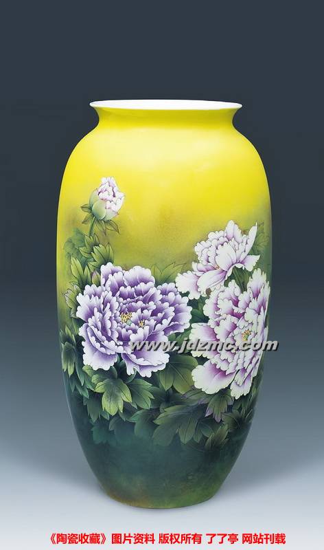 作品一、200件高温釉彩瓶《花非花》:艺术创作不仅表现自然物象,更要实现意象的表达。在中国文化中,借物言志的手法是展示中国人内心世界的一扇明窗。于是花非花——荷花成为清雅脱俗的谦谦君子。如同黄萍这件立意高洁的作品,精心勾勒,巧施粉黛的工笔荷花与挥毫泼墨,恣肆狂放的写意背景不仅是美学意义上工写、主次、虚实的对比,更是为了营造荷花与环境的反差,表达“莲之出淤泥而不染”的意在象外之美。作品二、200件高温釉彩瓶《国色天香》:“莲之爱,同予者何人?牡丹之爱,宜乎众矣。”周敦颐的笔下,牡丹是大众俗文化,这个“俗”不是庸俗,而是有着深厚底蕴的民俗。因此画牡丹要去庸俗,见底蕴。黄萍很敏锐地意识到了这一点,她选择圆润饱满的瓶体造型,运用鲜嫩的高温黄釉喷施底釉,从而给作品确定了一个富有寓意的调子。黄色有阳光、春天的含义,通常被认为是快乐和有希望的色彩。特别是中国历来崇尚黄色,黄色常常被看作君权的象征。于是,花之国色的牡丹在黄色背景的烘托下,呈现出花中之王特有的雍容华贵和蓬勃生机。给观者以吉祥喜庆又不失大方庄重的美感。