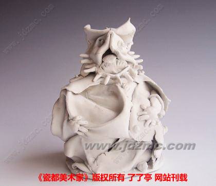正是在这样的情境下,任瑞华的作品格外引人注目。作为景德镇陶瓷学院教授,也是《艺术市场》杂志社艺术基地首批签约艺术家的任瑞华,在他创作的作品中有三个原则。一是具有时代性。比如《渴》,这件作品是作者有感当今世界在经济发展的同时,生态环境遭到破坏,利用艺术手法上的残缺美创作出来,以警示世人。作品在材质上选用高白泥,加上高温颜色釉、玻璃、青花釉里红进行综合装饰。造型是一只碗,撇开一个缺口,一个水滴晶莹剔透,将水滴将滴未滴的感觉表现的淋漓尽致。碗的一边用钧红釉表示白天,另一边用无光黑表示夜晚,中间镶嵌一块玻璃代表快要干涸的水。作品寓意丰富,碗的造型象征着人类对物质文明和精神文明的一种希望与渴求,而即将干涸的水和残破的缺口又让人联想到全球资源严重缺乏,需要加强生态环境的保护。作品不仅意境深远,色彩凝重深沉,美学底蕴深厚,更重要的是它具有能震撼人心的时代感。
