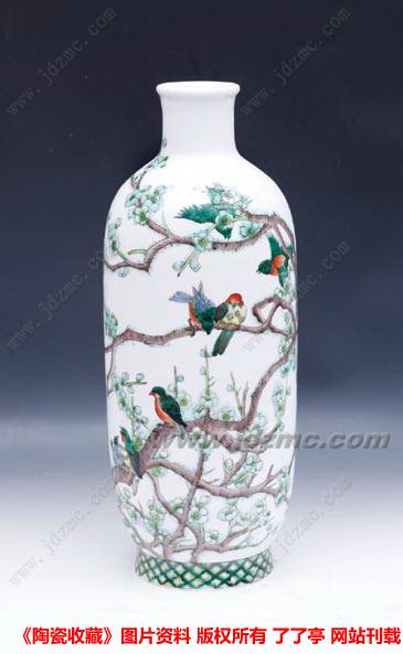求变和创新是陶瓷艺术发展的必然客观规律,品读程幸古彩作品,可见新风新意之处表现有三,其一,地均留白,器皿通体白釉,让大红大绿中添加了些许淡雅靓丽。传统古彩“美在大红大绿”,然确实显古板俗气,难以迎合现代审美眼光。更难能可贵的是,程幸在创作过程中实践探索及反复研制,除了深谙古彩颜色的光暗深浅规律外,在五彩基础上已经创造出更多适合现代审美的古彩颜色,丰富了古彩的色彩范围。其二,让创作题材由呆板的装饰图案渐向“采菊东篱下,悠然见南山”的意境山水转变,增加了其浪漫主义色彩。其三,构图理念上采用虚实结合的手法,让传统古彩版画式“实”构图“活”起来,既不失传统之精髓,又具时尚风格。不拘泥于装饰和客观物体再现,画面多了几分灵动和风韵。