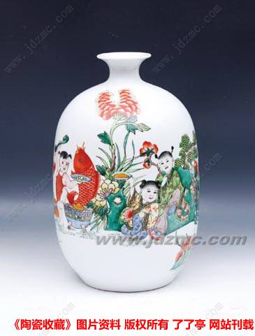 《乐在其中》婴戏图中,构图以童子为中心,配以仙草灵芝、寿桃、牡丹类吉庆题材。画面内容平衡饱满,整体 形式感已与新彩相结合。古彩鲜明的对比烘托出吉庆的气氛,两个衣着鲜亮的童子手捧桃篮行于生机盎然的丛中,红色腰带点缀着绿色的衣裳,纹饰繁而不乱,红扑扑的面儿洋溢着天真烂漫,稚趣可爱。童子抬脚之间的细节表现已让活泼和欢快气氛表达得淋漓尽致。方寸之间,画者用沉郁暗香的古彩色彩描绘浓郁的童趣,古朴中就又添了一分热闹。其中的感情色彩与观者记忆产生共鸣,令观者欣然,画者达意——对于画者,也许是“夕阳之下忆童蒙,会心一乐自从容”的又一番心境。
