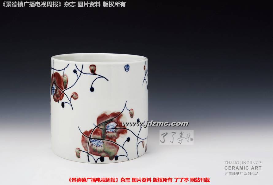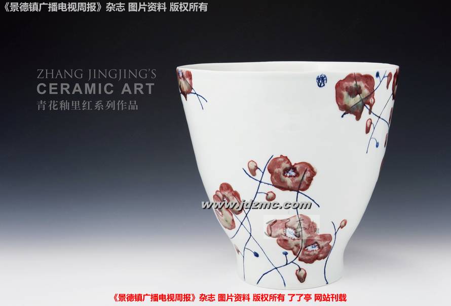 张婧婧的青花作品力图探寻景德镇的民间青花与现代陶艺的契合点,把中国传统的民间青花的抽象意味与现代陶艺的创作理念相结合,发掘个性化的创作手法。作品造型首先突破了景德镇传统以“圆”为基础约有限数理空间,使现代青花装饰载体的空间得到巨大的开放,形成丰富多彩而又极具个性的形体语言。装饰风格是建立在景德镇传统民间青花的率真、质朴、凝练、洒脱的美学内涵,浓郁的乡土气息之上。以简练的笔墨描绘物象,形成不重细节,取其大;不重形似,只重神似的艺术风格。在吸收民间青花之精华的同时,力图摆脱传统的束缚,探索一条有中国特色的现代陶艺之路。
