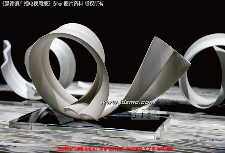 而中国国际航空公司新贵宾室选择的?“风生水起系列”作品的创作要素来源于水的曲线;水是和谐的代表、也是最流畅的一种状态,曲线更是典型的优雅线条,柔美的线条中包含张力。在追求极致线条美感的同时,更关注曲面相交构成的蕴含力量的线条与边界,以及线条与转折面共同构筑的亦虚亦实令人冥想的空间。在作品的创作过程中,先于工艺的形态构想是作品产生的基础,泥土的塑性与作品形态之间的平衡点是工艺的瓶颈。在合理应用泥土特性的同时,大胆改变由拉坯成型方式衍生出的传统形态,不论是二维的或是三维的重组,均建构出突破常人思维方式的作品形态,实现了作品空间的奇妙转换,试图在极大的限制中探寻属于个人的陶艺语言。由平面到立体,由器皿成型方式到雕塑化外在形态,跨越了陶瓷的成型极限。
