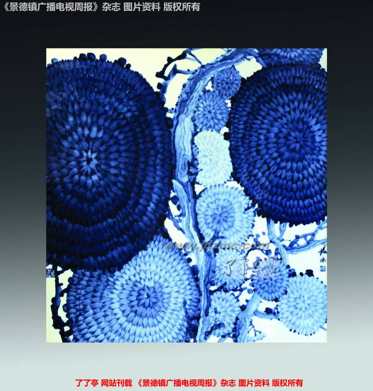 景德镇陶瓷学院的杨冰教授,多年来一直从事现代青花的创作和研究,画面以清新淡雅的色彩和独特的画面形式闻名于瓷坛。“向日葵”是她绘画中主要的表现题材,硕大的青花墨块如平面般展开,青花点依次排开,层层迭起,笔墨生动,清新自然,既有蒙德里安的抽象美,又有修拉的构成美,把现代主义的形式构成与中国水墨画中灵韵的点相融合,把生命起点的“点”,融入到她自己的艺术理想。以简练的笔墨,饱满的水分,在青与白的韵律和节奏之中,感受简约而深刻的美,给人以高品位的艺术享受,也许正是杨冰教授与修拉,蒙德里安超时空的思想碰撞,缔造出时尚的陶瓷现代青花,为现代陶瓷艺术创作注入了新的画风。(陆小泥)