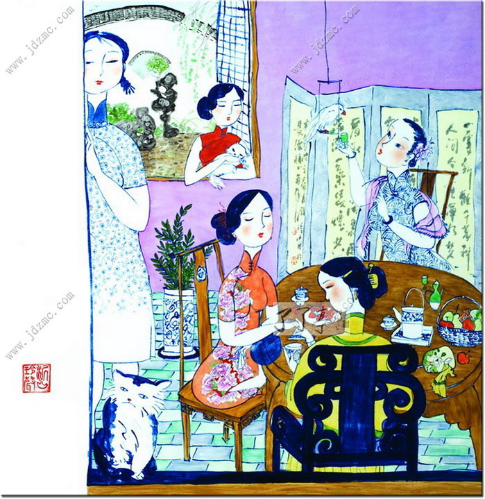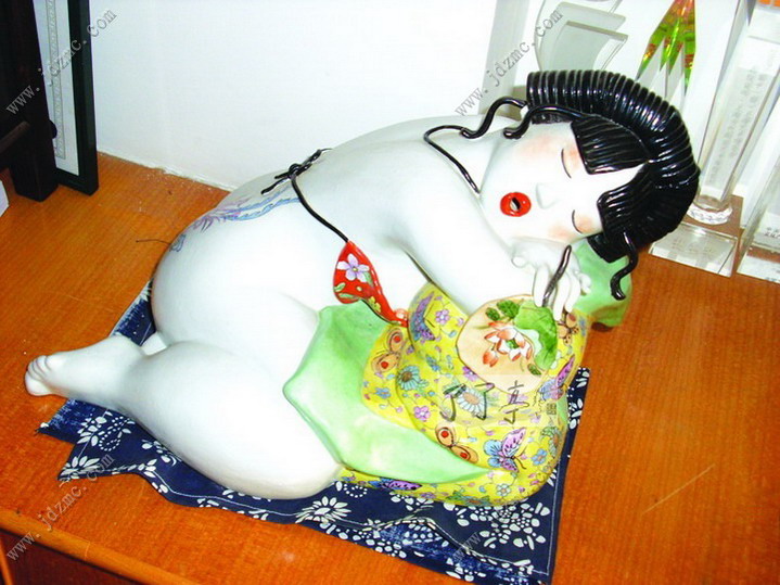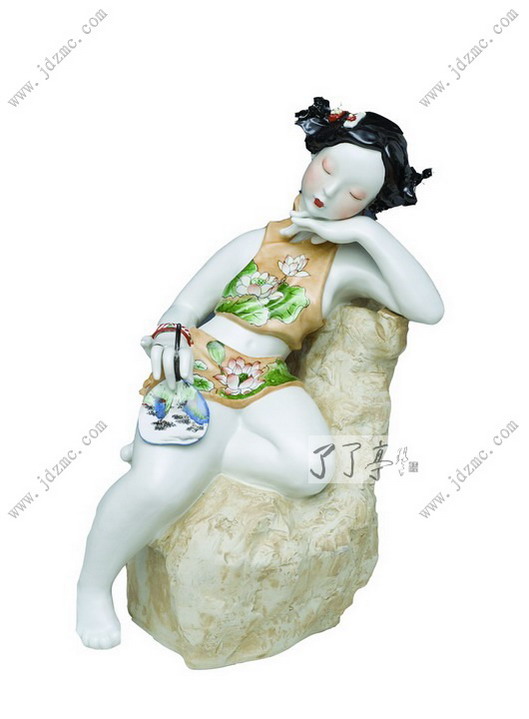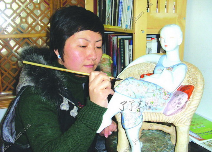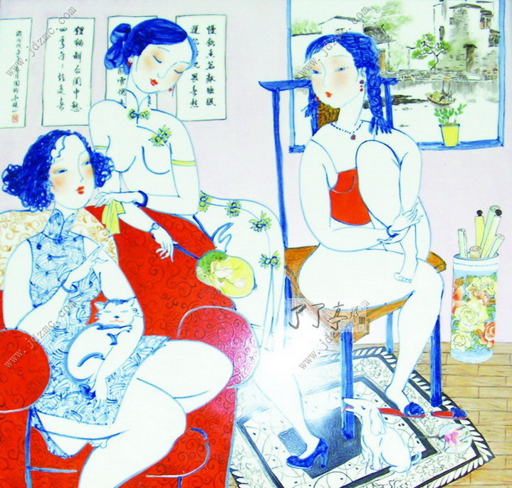 周玲有一手好茶艺。每当有客来访,或是好友相聚,周玲总是把珍藏的好茶叶取出,砌上一壶好茶,围桌而坐,一边品着茶,一边和朋友聊着生活、家庭、事业和孩子,也聊女人。与大家一道,尽情地享受着生活。 经过近十年的探索和打拼,周玲把手头的活计、心底的偏爱,融入到陶瓷艺术创作之中,在面向市场的摸索中,走出了一条属于自己的路子。付出,在精神和物资上都有了一定的回报,这时,周玲的生活也在悄悄地发生改变着。 2005年,周玲创作了《女人花》系列,作品中女人的神情,多了几分安逸,衣着装饰多了几分洋气,同时,也多了几分女人的成熟。她们在尽情地享受着美好生活带来的乐趣,休闲、自信,对生活充满了热爱。 这是周玲内心世界的真实流露。她在用泥与火的艺术,放歌一曲“女人似花花似梦”,唱给姐妹们听,也唱给自己听。 女人如花,世间每一个女子都如一朵花,她们在红尘中盛开着各自的花瓣,展开自己五颜六色花的衣裳,在那里放射着自己的香气,吸引着能欣赏她们,更能读懂她们花名的人生伴侣。在这个世间,女人是最最感性的灵物,如同那娇媚的鲜花会随着季节的变换而开放不同的花,这些花儿却大多做着一个同样的美梦,希望有人去欣赏她,读懂她,爱惜她,让自己尽情地绽放在这个美丽的开花季节! 女人如花,花似梦,这好像是印证了一个女人一生的经历,从春天花的蓓蕾开始,如同一个少女等待着生命的绽放,憧憬着自己美妙的一生。那刚刚开放的鲜花就像那少妇,饱满而热情,欣喜地观望着自己温馨的小屋,陶醉在自己的幸福里,并且深信自己永远会如此的幸福,和自己的爱人永远的沐浴在这爱的阳光里。而当那鲜花的花瓣开始变色,如同幕色的时候,此时的花经历了风吹雨打,经过了一切成长的过程,她开始明白很多的道理,并且在这些道理中把自己装扮得更加成熟而有自己独特的魅力,这时候的花更加耐人寻味,让欣赏她的人不由地停下脚步,细细端祥。 当立体的雕塑难以反映这些的时候,就用平面陶瓷绘画来表达,周玲开始用二维和三维交替着展现女人的内心世界。 周玲赋予了艺术以生活,同样,艺术让周玲享受到了生活的乐趣。 当初,周玲选择留在景德镇的时候,许多人都不理解,凭她的天资,一定能在大城市有更好的作为,尤其是在北京中央美术学院毕业的姐姐,极力主张她去北京发展,但她还是执拗地留了下来,和爱人一道在陶瓷艺术的田地里辛勤耕耘。在刚刚创业的时候,她尝试了陶瓷许多工艺,如今这些工艺,就像她手中的棋子,自如地运用到她的艺术创作之中。 回望来时路,不管成与败,周玲说,她是幸福的。《伊人》《醉爱》《添香》《女儿醉》等系列陶艺作品中,我们都能看到女人周玲的幸福,陶艺家周玲的幸福。