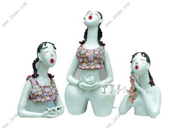 这是1999年7月的一个早晨,周玲趴在陶院女生宿舍的窗台上,目无表情地看着远方,一阵风吹来,她没有注意到自己的头发有些零乱。毕业了,她在想是去北京、上海,还是留在景德镇。路边的梨树已经结果,但还很青涩,离秋天还远着呢。 三年前,她从内蒙古巴彦诺尔市考入景德镇陶瓷学院美术系陶瓷设计专业。当初,她还不知道陶瓷是烧出来的。为了迅速了解陶瓷,入校两个月后,她开始四处寻找瓷厂实习,一边上课,一边实践。在这时,她结识了在雕塑瓷厂上班的王敏,也就是她现在丈夫。并在王敏和工厂师傅们的帮助下,周玲在陶艺方面进步神速,同时,也开始了她的朦胧爱情。1998 年,她在景德镇陶瓷学院展厅成功举办“陶艺·油画”个展,这时,陶瓷已经成为了她生命中的一部分。 景德镇有着千年陶瓷文化的积淀,有着丰富的陶瓷艺术语言,精美的材质、精湛的工艺,俯拾即是,还有爱情,这让徘徊中的周玲,选择了留在景德镇,并开办了“周玲工作室”,地址就在雕塑瓷厂。 周玲是有想法的人,毕业后,她不想和前人一样,去生产观音、罗汉、关公等传统人物雕塑,而是从材质和观念上去摆脱传统的束缚。这样,使她的艺术创作心路,比他人显得更加艰辛。很长一段时间,她是忙碌的,她尝试过堆雕、做过仿古、做过器皿,尽管这些,让她尝过不少甜头,然而,她却是苦闷的。 路在何方?她在思索着。 一日,周玲猛然醒来,她发现,自己的生活就是天生的好素材,女性话题永远是不干枯的井。2002年,周玲的创作方向锁定了女性题材,她献给人们的第一组风景就是瓷雕《晨曲》。三个表情各异的青春少女,在人生的路口,憧憬爱情、渴望知识、放飞梦想。周玲用夸张的陶瓷语汇,借助花、鸟和书,将青春少女的心迹表现得淋漓尽致,花象征着爱情、鸟象征着梦想、书象征着知识。这组雕塑粗放简约,又处处体现了一个女陶艺家的甜美与细腻。 其实,雕塑中三个少女的所思、所想,正是周玲毕业后一段时期的生活状态的呈现。 《晨曲》的问世,其大胆、简约、夸张的艺术表现形式,让人耳目一新。2005年,《晨曲》获得江西省美术家协会陶瓷艺委会“第二届陶瓷艺术作品展示评比”佳作奖。随后,周玲创作了《羞·舞》等女性题材作品。 一日之计在于晨,《晨曲》的成功,只是周玲艺术创作的序曲。