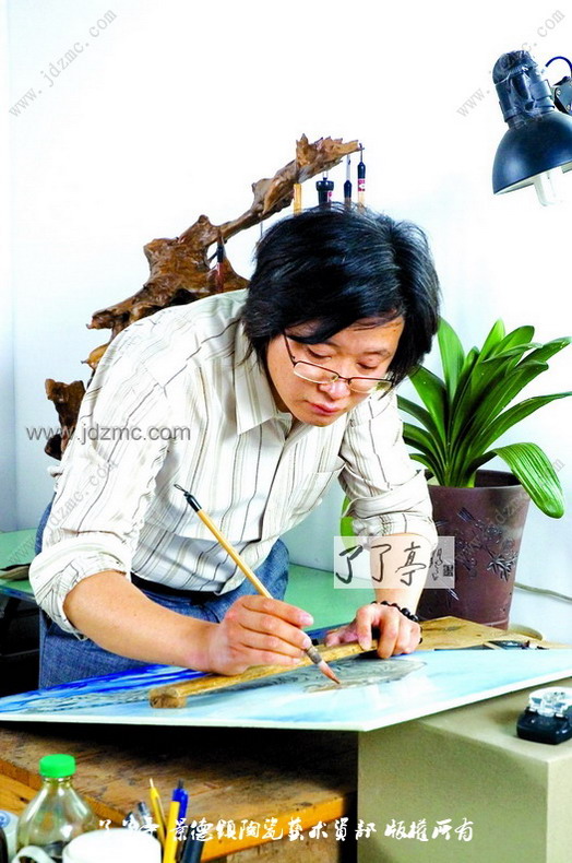 吴康高足 1986年,吴康大师受聘于鹰潭教习绘画,时年17岁的钟鸣有幸成为了吴康的学生。但因为学校的美术生源有限,加之鹰潭缺少艺术氛围,钟鸣所在的美术班成为鸡肋。 在此情形下,吴康便建议将美术班的学生带回景德镇,校方也乐于甩掉这个鸡肋,欣然同意了吴康的建议。 1986年6月,钟鸣和他的几位同学跟随吴康来到了瓷都景德镇,与吴康更接近于传统的师徒关系。 来到景德镇的第二天,钟鸣便在这个陌生的城市里,充分感受到了景德镇博大精深的陶艺神韵。吴康带着弟子们在景德镇逛了一圈,钟鸣到现在还记得当时去了工艺美术公司,还去了老邮局旁边的友谊商店,看到了珠山八友的作品。 从此钟鸣与景德镇、与陶艺便相识、相知,密不可分。 但在景德镇学徒就如达芬奇学画鸡蛋般枯燥,要和吴康学画肖像,首先必须学会打九宫格。 打九宫格是为了方便画瓷板肖像,一般画师会直接在瓷板上打格子。吴康大师的方法和别人有些不同,他让学生们将格子打在油光纸上,再将打好的格子印在瓷板上,这样可以重复利用。 打格子是件费力的事情,来求肖像者提供的照片多大,格子就得打多大,钟鸣记得有的提供的相片就只有黄豆那般大小,打格子就非常辛苦。即使这样,钟鸣仍是很认真地学习打九宫格,最多的时候一天打200多个格子。 钟鸣是同学当中格子打得最准的一个,现在钟鸣作品的造型功力就得益于当初认真地打九宫格。 时间长了,仅仅是打格子就很难消耗掉少年钟鸣旺盛的精力了。白天钟鸣老老实实在吴康那打格子,晚上就偷偷跑到石狮埠的夜校学素描。 一个月后,钟鸣“暴露”了。一位顾客送来一张小照片,要求为照片中十几个人中间的一位老太太画瓷板肖像。 一看照片,大家都觉得这根本画不了,照片中的老太太根本看不清楚,太小了,根本没法打格子。但当时又接下了这个活,而且派给了钟鸣来画。 钟鸣一看也认为打不了格子,索性便把格子丢在了一边,用学到的素描功夫,生生将老太太的音容笑貌搬到了瓷板上。顾客来拿瓷板画时非常高兴,连连夸赞画得神似。 吴康看完也很满意,对这个勤勉的学生更加青睐有加,从此只要是顾客送来很小的照片,大多交给钟鸣画,每每钟鸣也都能顺利完成。