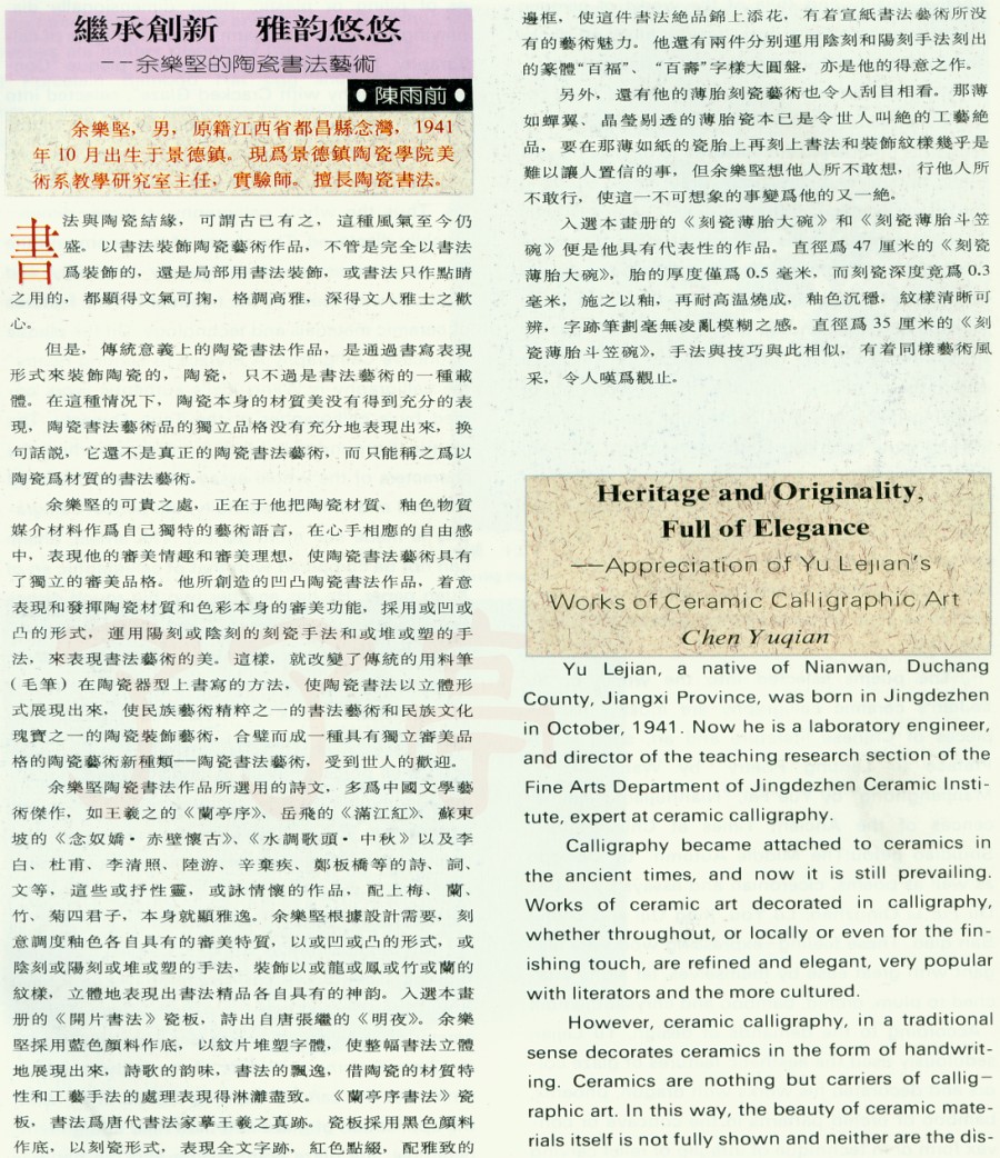 余乐坚的可贵之处,正在于他把陶瓷材质、釉色物质媒介材料作为自己独特的艺术语言,在心乎相应的自由感中,表现他的审美情趣和审美理想,使陶瓷书法艺术具有了独立的审美品格。他所创造的凹凸陶瓷书法作品,着意表现和发挥陶瓷材质和色彩本身的审美功能,采用或凹或凸的形式,运用阳刻或阴刻的刻瓷手法和或堆或塑的手法,来表现书法艺术的美。这样,就改变了传统的用料笔(毛笔)在陶瓷器型上书写的方法,使陶瓷书法以立体形式展现出来,使民族艺术精粹之一的书法艺术和民族文化瑰宝之一的陶瓷装饰艺术,合璧而成一种具有独立审美品格的陶瓷艺术新种类一陶瓷书法艺术,受到世人的欢迎。
