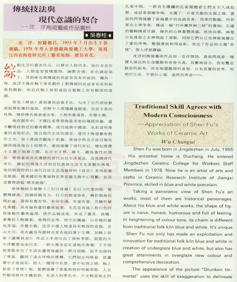 观沈浮的艺术作品. 以历史人物居多。他的青花作品,人物造型质朴憨厚,幽默含情;在色调渲染上.其韵味也与传统的民窑青花有所区别,独具一格。沈浮不仅在釉下青花创作上对传统的民窑青花有所拓展和创新,而且在釉上新彩或综合装饰上亦有较深的造诣。
