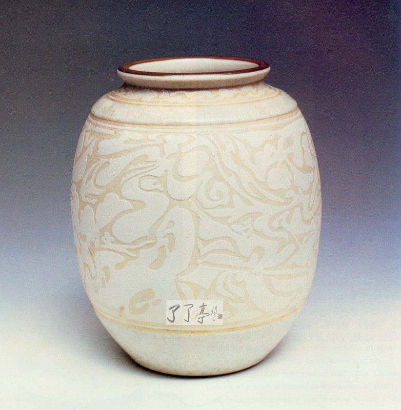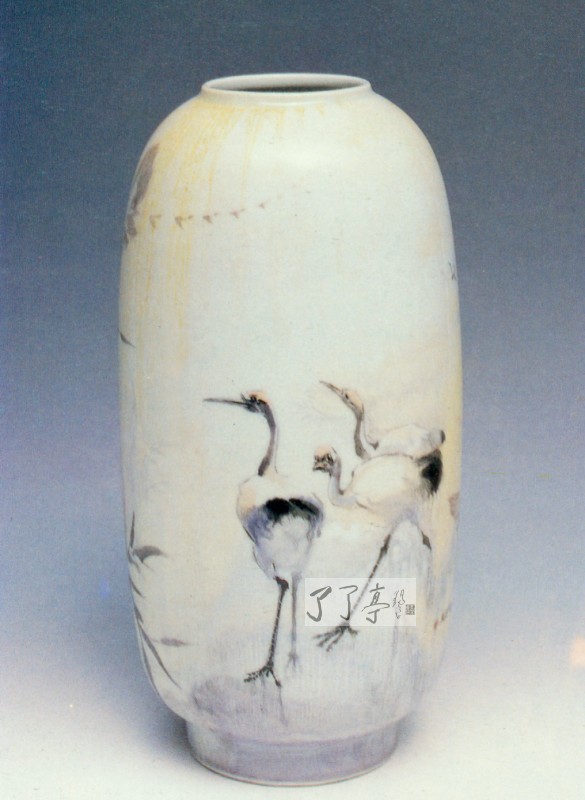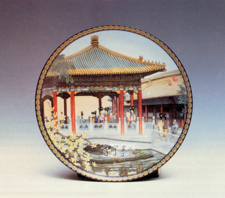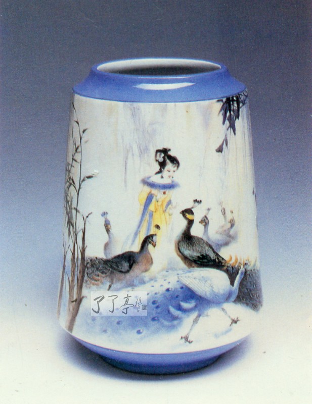 他在创作中,不仅注重学习陶瓷美术的传统技艺,还不断吸收相近的艺术精华.成功地将中国画、水彩画和漫画的表现形式。结合现代生活的感受.运用于陶瓷艺术创作之中。如《澄湍亭观池》彩盘,澄湍亭即北京故宫御花园西部鱼池台上的憩亭,画面描绘了清代帝后、嫔妃携带小工爷于初春之际.在亭中下棋、聊天。观鱼养性的情景,整个画面具有浓郁的清代宫廷生活气息,是我国清代帝后,嫔妃的闲逸生活和宫廷贵族生活文化景观的再现。他同期创作的以清代宫廷生活为题材的《故宫》系列彩盘花纸稿,被美国的布莱福特世界彩盘交换中心买断,并高度赞誉该稿“精美绝伦。