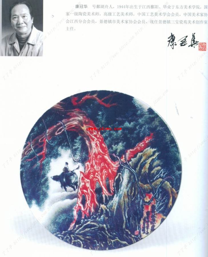 在这幢三层的楼房里,存放着多幅康冠华的大型山水瓷板画。一块圆米苑的大瓷板上,用黄釉和釉下墨料画就的山崖间,万千条飞练腾空直泻,汇成巨大的瀑布群。而作为近景的松树,古朴遒劲,苍健清逸,锃亮的色釉,酣畅的笔墨,构成了气势恢宏的《山川之歌》。康冠华对松树情有独钟,在《松风飞瀑》中,古松的树干,远处的山峰巧妙地采用了色釉,与青花绘就的瀑布形成冷暖对比,有如日照霓虹的效果,清新秀润,意境深远,给人力量,催人奋发。《江山多娇》为一幅宽银幕比例的大型瓷板画,在雄奇险峻的峡谷间,大江茫茫,铁索桥由远而近飞越横空,天堑变通途。他的画展现的不仅仅是壮丽的河山,还在于它讴歌了人定胜天的豪情。他画的《鄱湖欢歌》,浩淼无边,白帆点点,春和景明,人欢鱼跃,表现了人与自然的和谐,体现了科学发展的时代主题。《密林深处》是一块员米直径的大圆盘,在重重叠叠用黄釉和釉下黑、绿颜色构成的密林间,视觉中心他用釉里红画了一株古榕,蟹爪似的树干之中,亮出一角空间,一位牧童骑牛悠然而去。釉下颜色的熟练使用和良好发色使画面生辉,多姿多彩。在细细的品鉴中,我读懂了康冠华为什么钟情大型瓷板山水画,千峰竞秀,万木葱笼,江河湖海,浪遏潮涌,溪涧瀑流,云卷风啸,岂是尺咫之作焉能为之芽只有大画幅大手笔,才能表现充分,才能挥洒自如,才能满足人的视觉要求。可要绘制如此宏大的画面,从谋篇布局笔墨处理到烧制完成,作者没有宽广的胸襟良好的体魄是不行的。康冠华釉下彩创作画路很宽。他画马同样画在直径员米圆的大盘上,黝蓝色的背景象征着深邃的海洋,一匹白马傲然破浪而出,双目神注,鬃须飘逸,作者用喷、彩、刻、绘相结合,釉下瓷画技法炉火纯青,恰到好处。这块题为《马到成功》的瓷盘荣获景德镇第二届陶瓷艺术作品展评佳作奖,入编多种大型画册,在中央电视台播出。他绘制的大型《虎》盘、《雨后松涧》大型瓷板等作品参加台北雅文画廊、台中市立文化中心举办的《景德镇陶瓷精品展》受到瞩目,并为台湾《典藏》杂志发表。他已经置身于中国工艺美术学会会员的行列,他的作品早在员怨怨怨年就被选送北京参加《庆祝中华人民共和国成立缘园周年景德镇陶瓷精品展》,并入编《景德镇陶瓷全集》、《景德镇当代美术作品集》、《景德镇当代陶瓷美术百家》等画册,深得收藏家青睐,为国内外收藏。康冠华已年过花甲退休,本应闲暇在家,但他却把全部的身心投入到陶瓷艺术创作之中。我劝他多保重身体,改画一些小幅釉上作品,他摇摇头,还是埋头他的釉下彩,思索的眉宇间,无声的应答仿佛是:路漫漫其修远兮,吾将上下而求索......