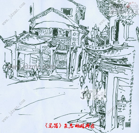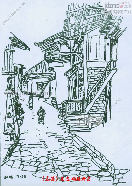 所以田锋还是个画痴,学生时代他就开始天天写生,写生的地方大多是景德镇弯弯曲曲的街市弄堂。这些弄堂我们每天都在看,看似毫不起眼,但在田锋眼里中华南路的旧屋、瓷器街的老铺都装满了故事,这里的每一块瓦檐,每一个木结构的花纹中都蕴含着人间真情。这是一个和名山不一样的世界,一个是开阔的境界一个如醇厚的老酒。