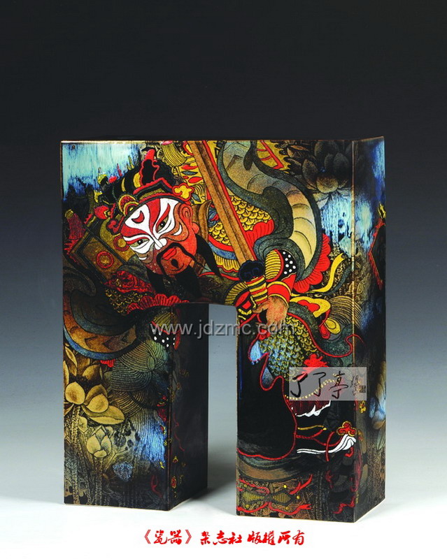 戏曲在表现手段上分为唱、念、做、打,在角色类型上分为生、旦、净、末、丑。穆桂英是戏剧巾帼英雄的典型形象,杨杰通过打散、穿插、组合的构图表现了戏曲人物的服装、头饰、神态、脸谱和纹样等元素,结合油画和国画的表现形式,融入色泥色釉的独特韵味,采用了画、堆、填、刮的手法。画面中穆桂英形象英武,整体主次分明,脸谱色块的组合使传统的元素更具时代感,画面气韵融会贯通,陶瓷的材质美感展露无遗。