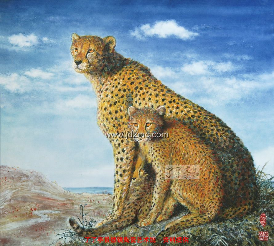 。作品《向往》中,一对大小猎豹蹲坐在草原山丘,眼神凝望着远方,但他们的脚下却是大面积沙漠化的土地,几株枯草预示着曾经繁茂的草原...正是这种灰暗沉闷但极具震慑力的物象发人深省,充分唤起了人们保护大自然,爱护环境的意识,无声胜有声,这种艺术的感染力令人惊叹不已。