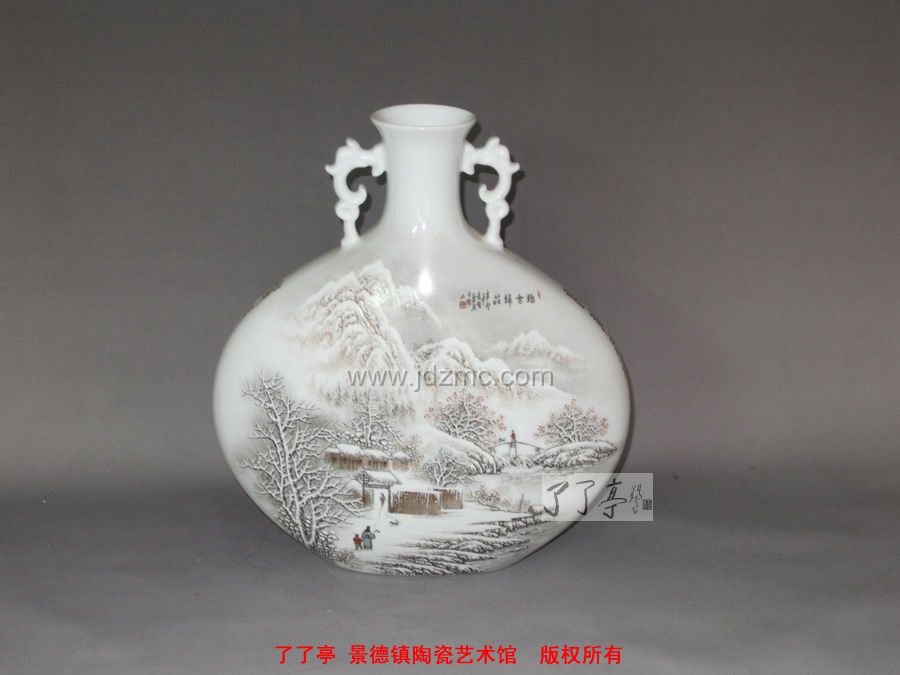 袁智勇的粉彩山水创作同中国山水画的创作在“气”的处理手法上一脉相承。他说,“气”是视觉欣赏同天地的时空和自然运动表现凝集的一体。无论审美的内在价值还是审视判断力,是审美体味的内在行为和审美的持续性的价值。而陶瓷粉彩山水创作由于质感和造型的展示,因而其审美时空感具有运动、流动的变化美。熟悉和了解袁智勇的人,都知道他性格比较文静,不善言谈,然而他总喜欢把自己的想法与思索融进绘画之中,让作品与人去交流、去对话。他也时常站在自己的画作之前,不停地上下打量,像是画里的人在寻找着什么。袁智勇说:从艺十几年来,他在山水之间寻找着自己的陶瓷绘画语言。看他的《溪山雪霁》,既继承着其父袁世文《黄山雪霁》、《江南雪霁》的绘画风格,同时在创作中又追求新意,张扬着自己的个性。他的作品充分地运用了中国画的技法,在用笔讲究、画法细腻中做好文章、使其工笔中见写意,构图严谨、静中见动.给观者身临其境之美感。历年来,他的作品屡获大奖,成为陶瓷艺术界崭露头角的佼佼者。