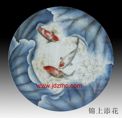 笔者在胡文峰的工作室看见了一件瓷画,这件作品极具胡文峰风格。画中以蓝色的荷叶为水,几条色彩斑斓的鱼儿穿梭其中。写实与写意恰到好处的搭配,给这件作品增添了几许不一样的韵味。