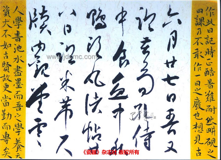 “境很容易达到,但创新就很难了。书法不像画画,达到一定高度后,要写出自己的风格,其实是一件很难的事情,我争取在行草书中找到自己的方向。”对于未来,雷云已经有了目标,虽然依旧是书法,但是载体却变成了瓷器,“在景德镇从事艺术这行,必须走陶瓷这条路。我们将书法移植到瓷器上创作,也是为了突出瓷器本身的美。”