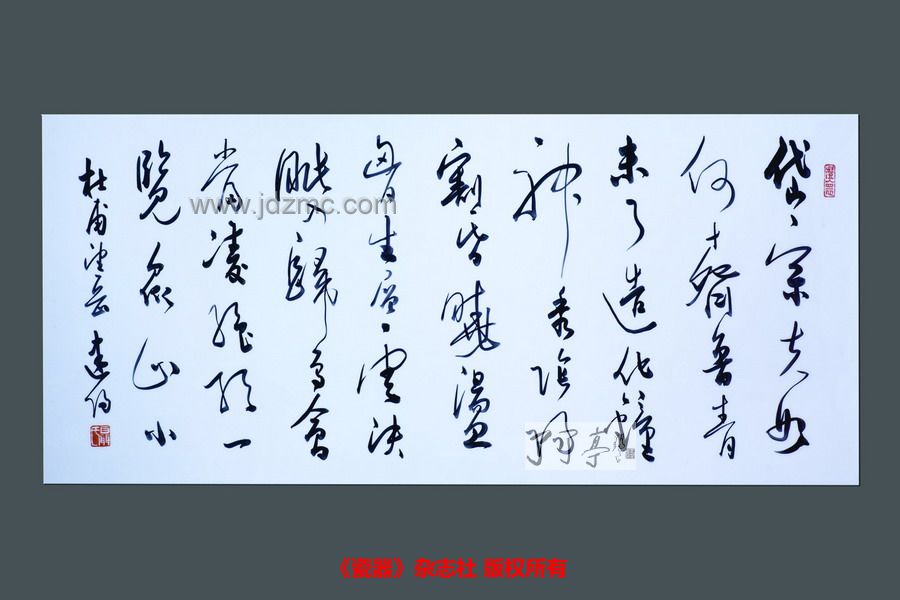 他的书法有着扎实的功底和显著的个人追求,无论是条幅或楹联,奇峭的结体、坚实的线条、浓枯相间的墨色、疏密有致的章法,以他独有的艺术语言展现在大家面前,大气豪放,耐人寻味。近年来,已经在书坛崭露头角的他,开始致力于陶瓷书法的创作和研究。他和他的同伴已经下定决心,要在陶瓷书法中闯出一片天地。