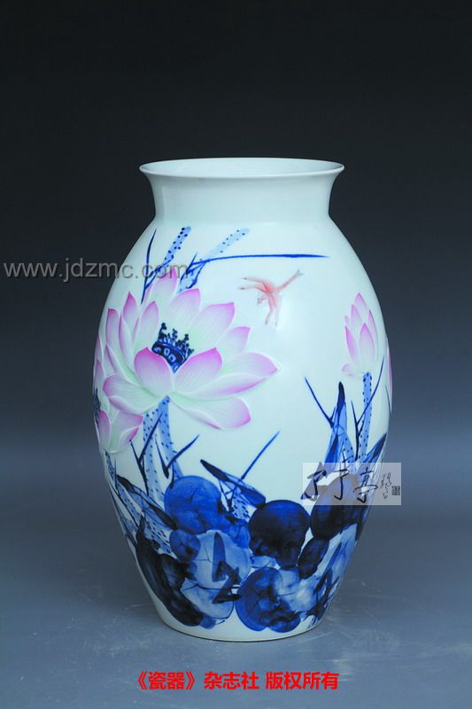 除了荷莲外,富贵荣华娇艳妩媚的牡丹,随风颤动暗香漫盈的凌霄都成为其表现心迹的载物,或大或小,或瓷板或瓷瓶,或青花斗彩或暗刻影青,均注重格法,用笔凝重,着色浓丽而不俗,画风朴实,不漂不浮,翡翠娉婷。欣赏她的作品总使人想起“间关莺语花底滑”的意境。