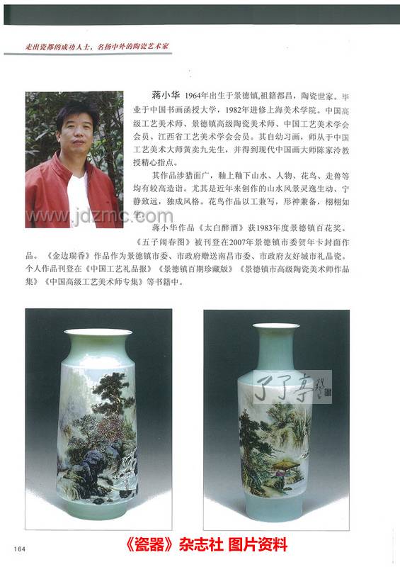 了了亭 景德镇陶瓷艺术馆 本文刊发于《瓷器》杂志 增刊:蒋小华 1964年生于江西景德镇,1983年毕业于上诲市美术学校,1989年毕业于中国书画函授大学国画专业,工艺美术师,最早师从于
