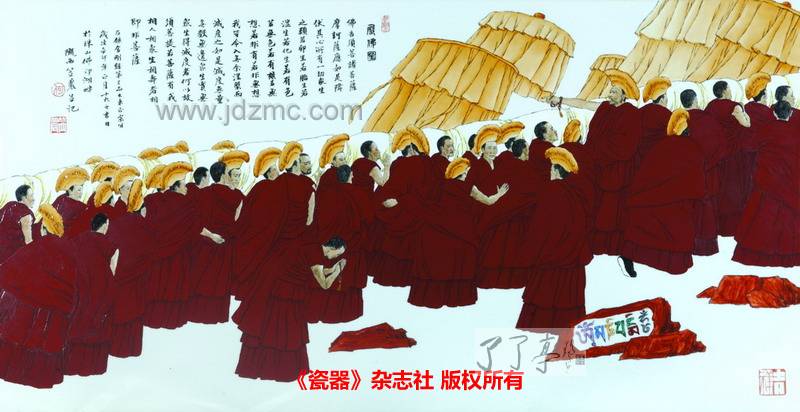 在这三年里,何笠农陆陆续续地创作了《展佛图》《赛马图》《康巴汉子》《老人与狗》等等西域风情题材的粉彩作品,当这些作品在江南美术馆突然亮相时,那些熟悉和了解何笠农的人们在震惊之余,颇有些陌生,他们对何笠农作品的审美突然被颠覆,但很快又变成情理之中了,因为这就是何笠农:何笠农不会一成不变,不会重复,更不会躺在已有的成绩里吃老本。