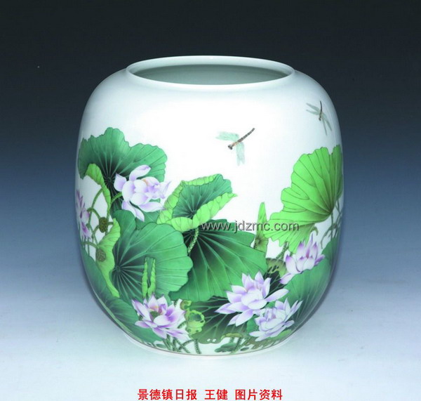 王群老师在创作中很好地借鉴了国画的语言和境界,把国画的笔墨韵味、层次渲染运用到了瓷画当中,例如以荷花荷叶为题材的一些作品。在她的笔下,以洗染技法表现荷叶,让景物层次鲜活、明暗相宜;运用新粉融合手法表现荷花,丰厚而又清纯、娇嫩而又不妖冶;再以笔蘸技法沁润整个画面,让瓷瓶和画面自然统一,实现心与境合,物与人合的优美境界。