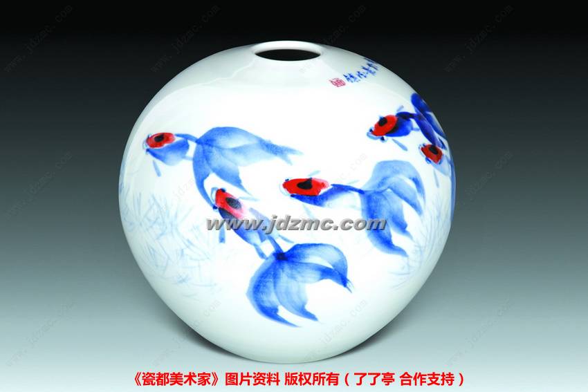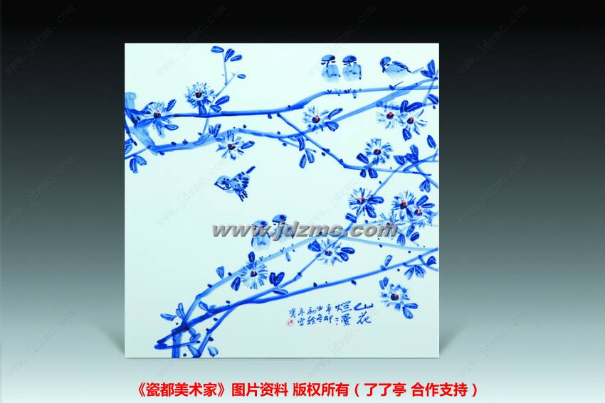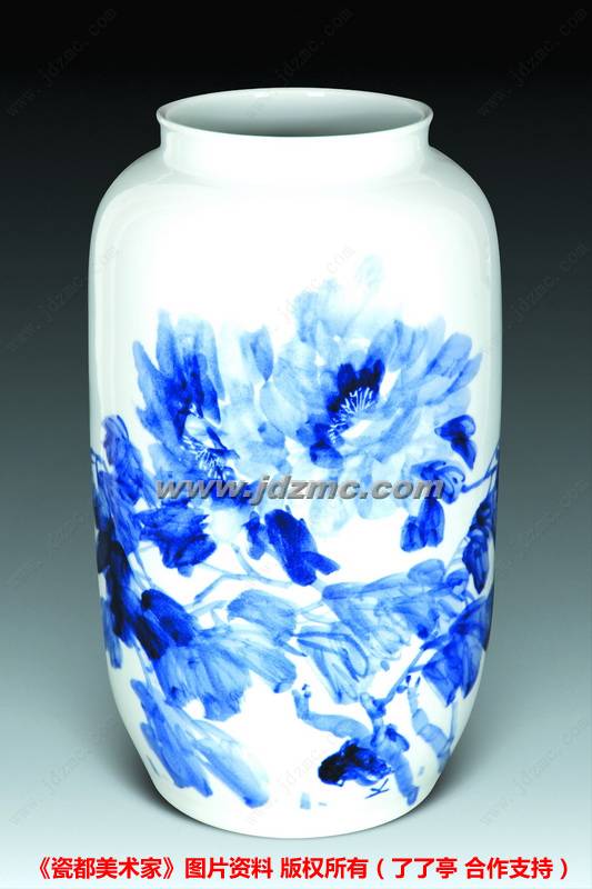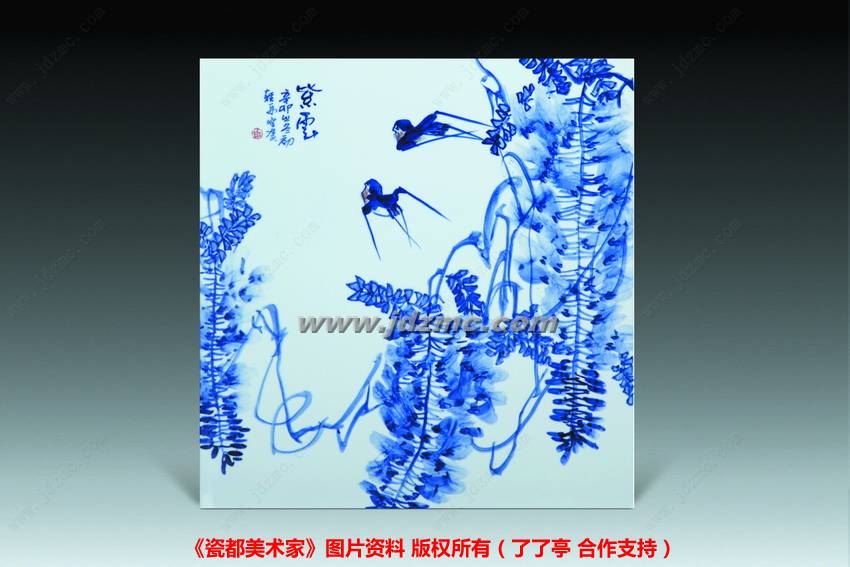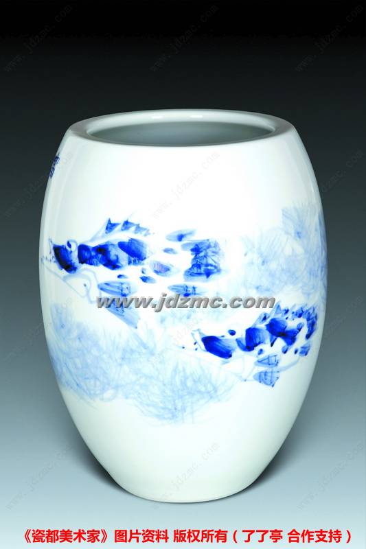 谈及国画与陶瓷绘画的异同时,陈老认为,陶瓷不同于平面的宣纸,是立体造型的载体,具有典型的三维空间。所以,瓷画除讲究笔墨的顿挫、连续、勾勒、晕染等国画技法外,还应充分利用陶瓷综合材料及工艺的规范,努力地突破笔墨的局限,通过釉色的流变、釉变和窑变,使陶瓷艺术与国画艺术达到融为一体的最佳效果。