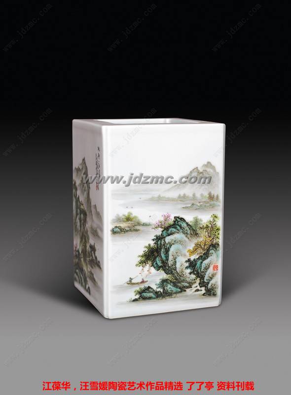 江葆华系高级美术教师,他既受过良好完整和严格的美术系统教育,又教学相长,艺术理论水平与修养都比较深厚。加之长期以来,他利用业余时间从事汪派山水瓷画的学习与创作,艺术实践与理论研究双轨同步,好比是如虎添翼,走出了一条既属于自己又脱胎于汪派山水瓷画的继承与创新的艺术之路。而汪雪媛作为他的夫人,又同为汪派山水瓷画的传承人,两人志同道合,切磋砥砺,同样在汪派山水瓷画的继承与创新上留下了自己深深的脚印。