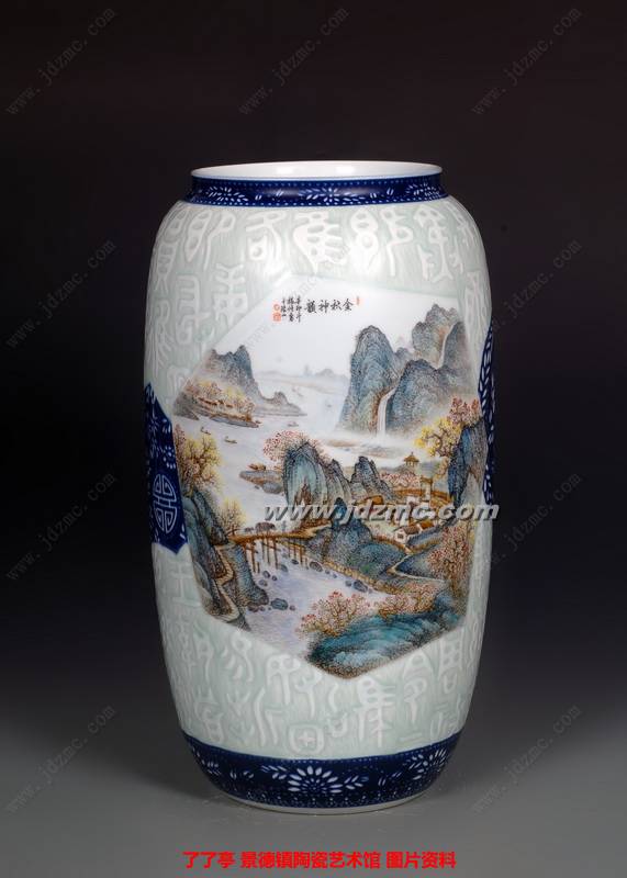 其代表作之一《千山寒江雪》瓷板将人们带到了这种新的意境中,画面布局合理,湖面开阔,烟波浩淼,茂林远山,庭园长廊。整幅画面描绘的是春天的雪景,却表现了万木逢春的绿意,虽冰天雪地,却遮不住春天的气息,大树虽被雪压住却挺拨向上,生动有力,近处片片树林,淡淡的春绿将雪衬托的更白,绿叶上的积雪,点点簇簇,莹洁而松厚,宛若轻轻摇动树杆冰凉的雪花就会随之飘落下来。庭院中,早起的人们在清扫积雪,湖面上,勤劳的渔民划着一叶叶轻舟开始了一天的劳作,衬出了一幅清润可人的江南美景。