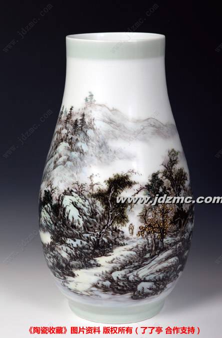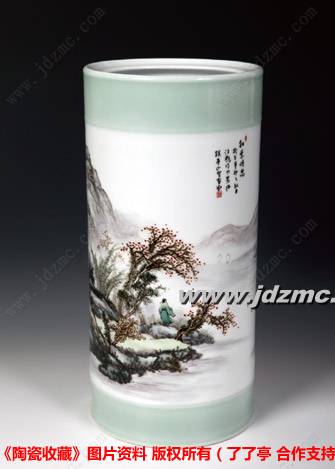 经过多年的系统学习与训练,她的汪派山水瓷画艺术取得了长足的进步,不仅继承了汪派山水淡雅空灵,文人气质深厚的特点,在构图用色方面亦是别具韵味。例如她的茶壶、笔筒、印泥盒等作品,其瓷画里的山水层次分明,远近疏密适中,山与水的结合恰到好处,用笔用色简洁洗练,常以小桥、草庐、轻舟、苍松、红花、奇石等点缀其间,给人以赏心悦目的视觉享受,加之又是墨客们较为亲近喜爱的文具系列,因此受到都市里喜好寄情于山水之间的诸多文人们的追捧,纷纷收藏把玩。尤其是她的一幅名为《静立》的瓷板画作品,整个竖长方形瓷画的上面三分之二全部留白,只在下面三分之一的地方以汪派山水最擅长的青绿色勾画了一块起伏不大的山地,中间有一淙溪水流过,溪边一棵小树拔地而出,突破于山地平面,孤独坚强的挺立着。这个作品构图对比强烈,清新简洁,立意大胆深远,不拘泥,敢突破,而且又有传统汪派山水的内涵在里面,是一幅传统与现代兼而有之,不可多得的现代好瓷画,也最能体现汪艳既是陶瓷世家传人,又是接受过系统学习的学院派的双重背景与价值。不善言谈,低调勤奋的汪艳,祝福她在陶瓷艺术创作道路上立意进取,再创佳绩!