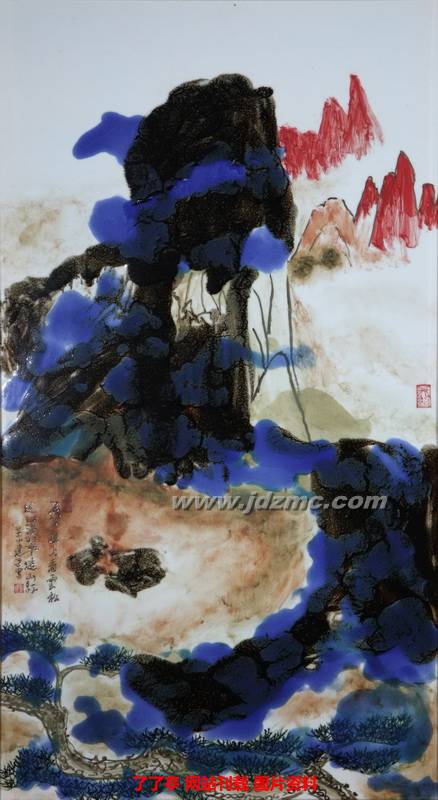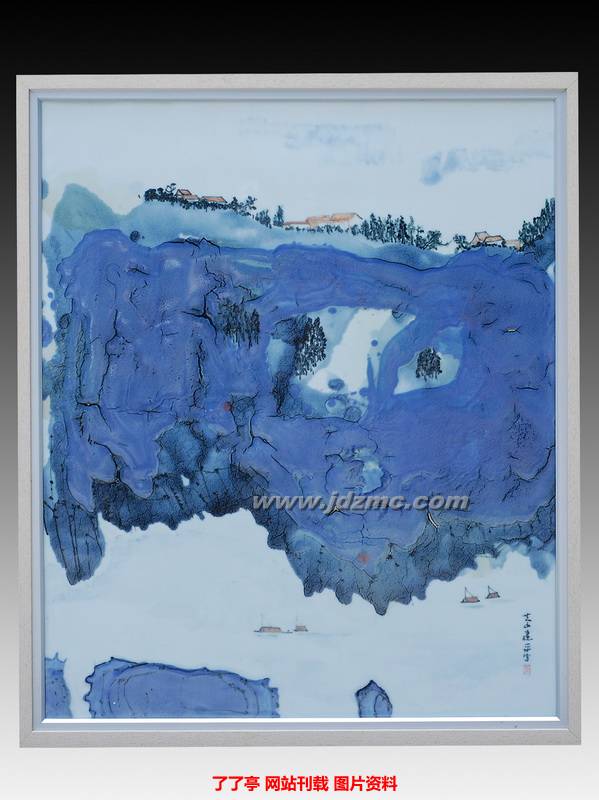 李建平的山水瓷画化古融今、别开生面,如《秋江泛舟》瓷板画,大胆采用泼彩技法,使高温蓝釉自由流淌于坯胎之上,利用其特殊的肌理效果,形成壮阔雄浑、厚重磅礴的气势,而疏疏点染的片片舟帆、间间小屋,使画面充满深远意境。再如《黄山石笋》瓷板画,运用色釉泼洒出瑰丽奇谲的视觉效果,老松、怪石、远山,奇妙穿插,仿佛步入化境,颇有奇幻之美。