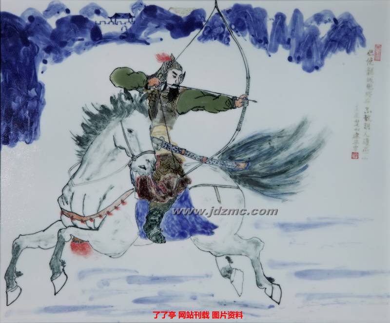 李建平的人物瓷画工写兼备、形神俱佳,如《飞将军李广》瓷板画,各色釉彩组合成一幅完美画面,骏马扬蹄、汉将军李广返身弯弓、气宇轩昂,其深厚艺术功力可见一斑。