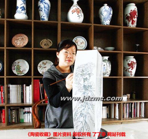 她创作的陶瓷粉彩作品主要探索点染、洗染、撞色等技法的运用。在洗染积色中,色相并不多,但色彩感觉丰富,又很优雅含蓄,色彩突出但并不妨碍墨色的微妙变化,反而使画面气氛增添意境的倾向,色墨互相辉映,色调稳重古雅,耐人品味。尤其是画面中常出现的一些树干、枝条、石头等题材中对陶瓷釉料的撞、积、染的用笔和有力的墨线支撑着画面的基本结构,形成既有现代感、又有传统笔墨魅力的画面。