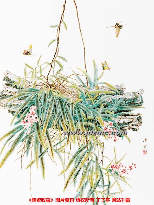 王清丽表达的题材大多是热带雨林花鸟景象,面对纷繁庞杂的雨林场景,一般画家总是望而生畏,可是她特别有兴致,常常取繁景,一花一蕾,笔笔铁画银钩真真切切,极尽花卉之能事。在她眼中,无穷无尽的层次和丰富复杂的变化,正是大自然生命的美妙所在。她的大型粉彩瓷板画作品《雨林之乐》呈现给我们的感受,仿佛艺术家进入树的体内,静静地从中和它同呼吸,体悟自然的心灵之音。倔强的老藤枝干曲折盘旋,节节回顾,稳健线条有条不紊地画出了所有细节的脉络和筋骨。她的作品《山涧幽香》将物象移入画面,经天营地,让人感叹其清晰的头脑和一丝不苟的耐心。《谧》笔调稠密浓重,精微中见法度,令人吃惊她有着如此对自然精微的观察与写生。《知秋》表现出繁密中显空灵,寓写实于抽象的内涵。《绣球花开》善用团块结构来加强整体气势,追求雄实、刚强的审美趣味。《硕果》善于在实中巧妙地用虚来穿插、照应,使画面呼吸畅通、韵致生动。所以,她的陶瓷绘画语言结构整体上是气度浑然的,但在细节处却流溢出粉彩花鸟的明净、静谧、清秀之美。