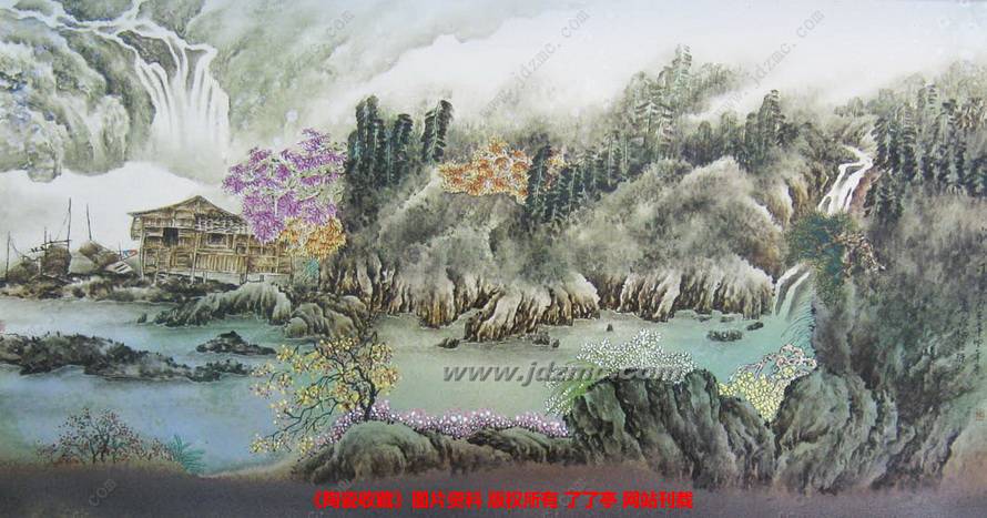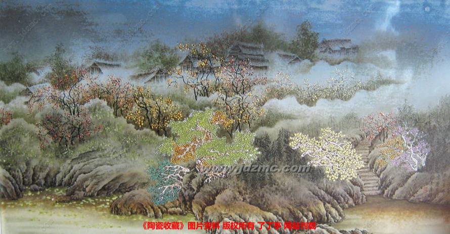 如其陶瓷山水作品《山花争艳》和《江边即景》,即是将油画的光影处理和透视技法运用其中,产生强烈的立体感和层次感,然后再与中国传统重彩画的工细与色彩表现结合在一起,给人一种耳目一新的视觉感受。