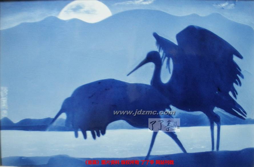 作品《晨曲》既是用这种手法创作出的一件作品。画面表现的是,青山碧水间,日出东方,两只鹤振欲飞,分水技法将山水的灵秀一展无遗,两只鹤以剪影的方式出现,摒弃了复杂的细节描绘,以简洁明快的剪影传达出更直指人心的宁静。