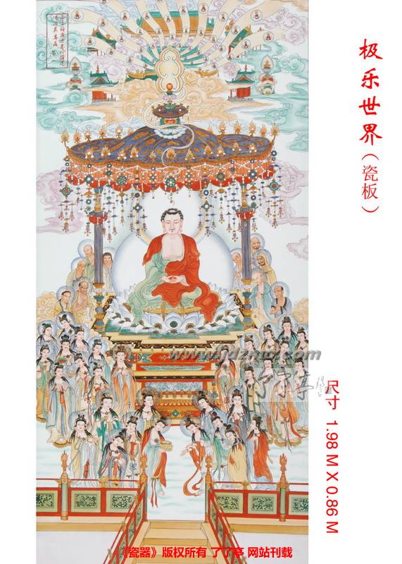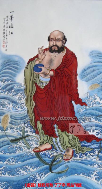 虽然藏家酷爱这类作品,但钟春明从不满足于只做“皇帝专业户”。在他的画室里,一只高大直顶屋顶的书柜里,塞满他从全国各地收集回来的关于瓷器、绘画的书籍,而这里还只是他藏书的一部分。从上世纪90年代起,钟春明深感手头资料的匮乏,无论去到哪一个城市,他做的第一件事就是一头扎进图书馆找资料,“当时想创作一些唐卡瓷板画,别人都去逛故宫,我先去北京最大的图书馆,带回来资料几年以后,景德镇才开始有相关的书籍。”正所谓“功夫在诗外”,钟春明多年来的累积使其在近年的创作中愈发得心应手,他创作的《一苇渡江》及众多“唐卡”类作品,源于传统艺术,又创造性地在构图形式、表现手法上增添新意,可谓厚积薄发的典范之作。