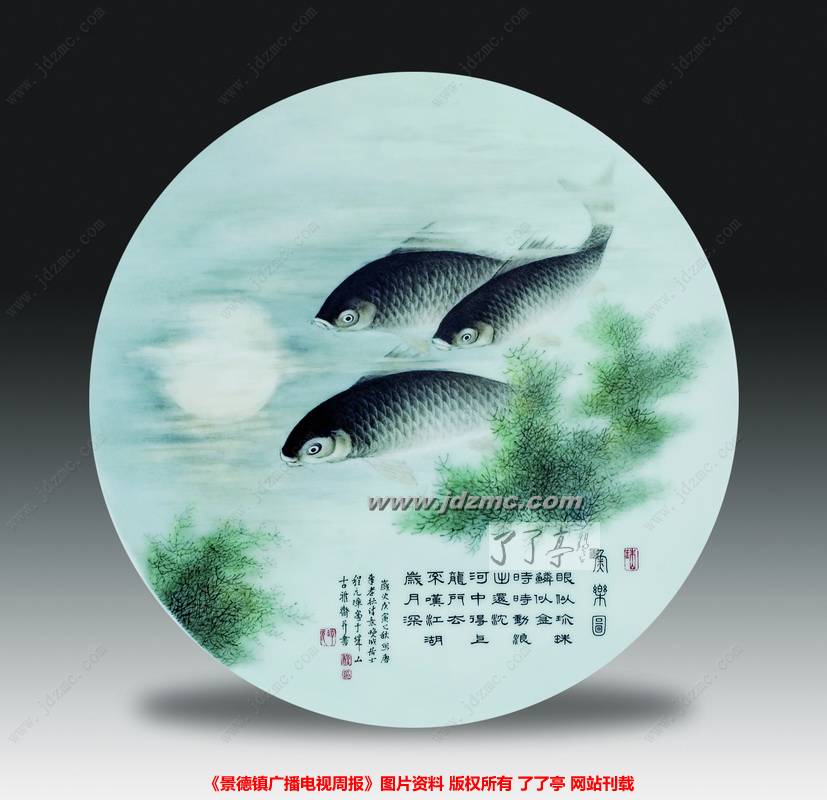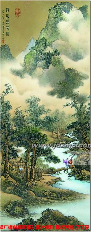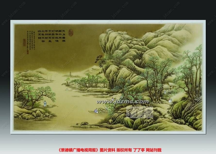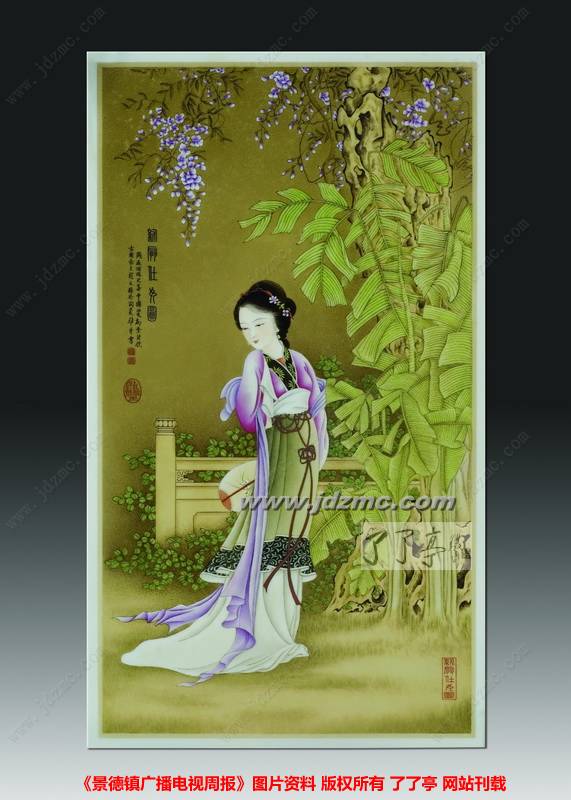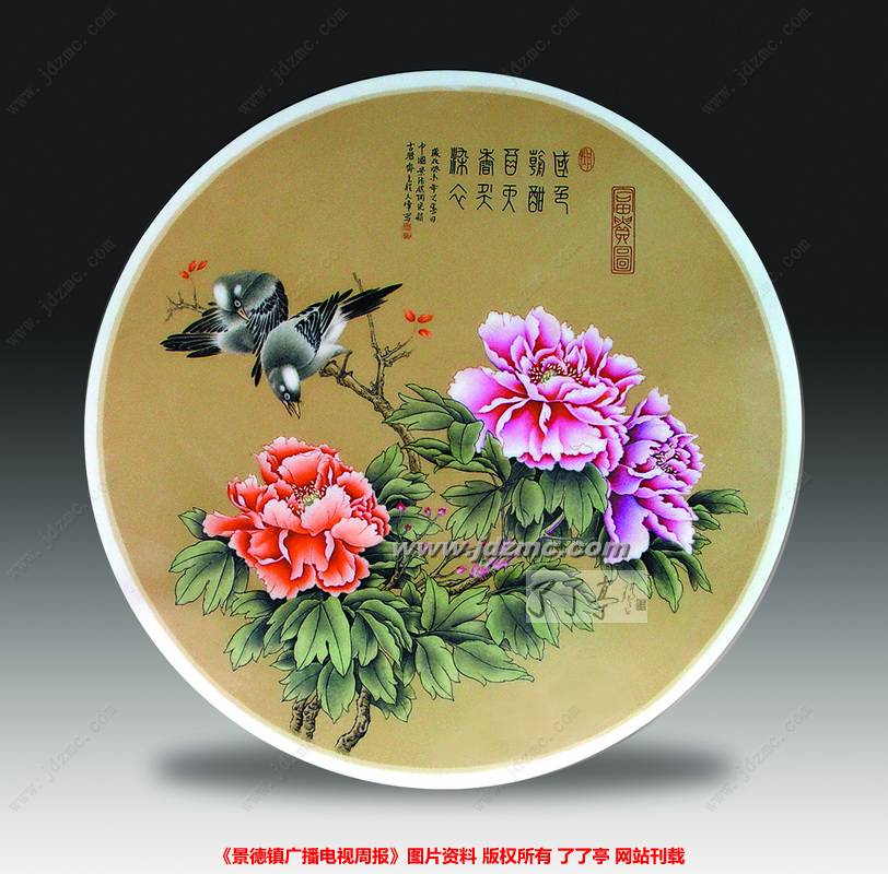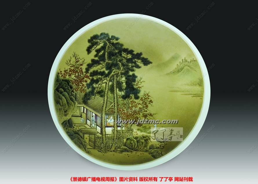 于是,寻访到他在市陶瓷博物馆的工作室里。这是间斗室。斗室里却正孕育景德镇的陶瓷艺术珍宝——用“古雅彩”技法绘制的瓷盘、瓷板画。随意看去,其画面色调如年久泛黄的绢、宣纸国画名作一样逼真无二。犹如—幅幅国宝真品,镶嵌到了瓷板上,虽饱经历史风雨沧桑,但仍不失丹青本色。细细品味,这些传统题材的瓷板画,山水画显得幽远深邃,给入恬静淡泊之感,依稀可见宋代范宽,明代蓝英沈周等人的笔墨情致;那仕女图亦灵秀优雅风姿绰约,让人觉得甜美悠静,隐约可体味到明代唐寅清代费小楼的画风神韵;至于花鸟图,则更是灵动纤细,甚得明代华癌的翎毛画三味。这些瓷板画,无论是取材构思布局,还是线条用料着色,既呈现了中国传统绘画艺术的遗凤,又蕴含着西洋画技法的流韵,显示了作者深厚扎实的艺术功底.展现了有独特个性的艺术语言,有创新追求的艺术风格。