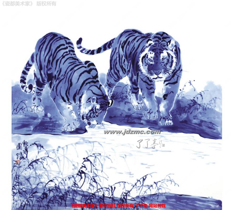 展览现场,一幅幅作品让观者叫绝,其中一幅《饮泉图》更是吸引了大家的眼球。《饮泉图》是作者十二生肖系列作品之一,作品以两只老虎在河边饮水为主题,勾线汾水技法老到,充分显示了作者青花汾水的高超技艺。