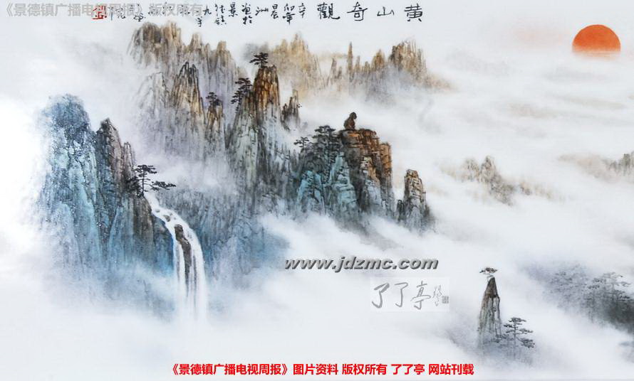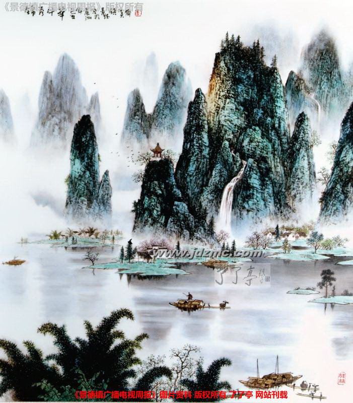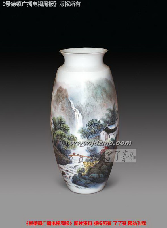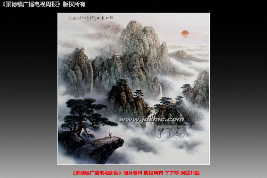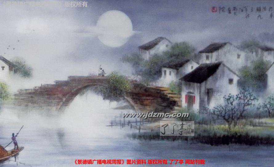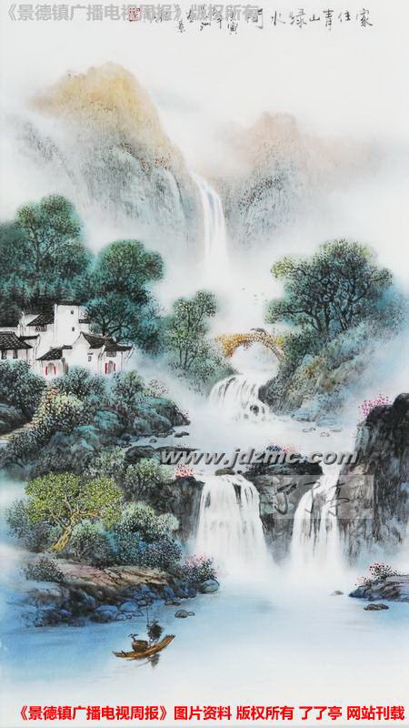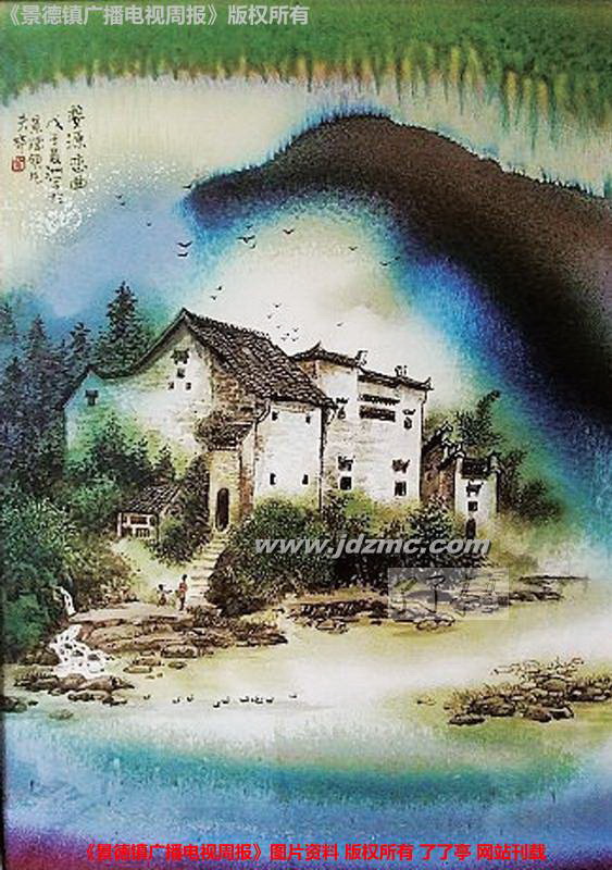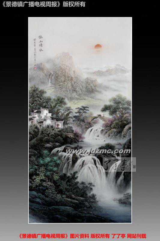 观余晨洲大师的山水瓷板画,我们可以看出:先生山水瓷画或以简约淡远、浑厚朴实、虚实相生见长;或以狂、放、简、奇见称,或由写实转向写意,或工写兼备......他的作品在强烈的明暗色彩对比中始终蕴含着整体的谐调与柔和,尽管崇山峻岭,云遮雾绕,山路盘旋曲折,远山近水层次繁多,但画面仍清妍秀润,意趣生动。小桥流水流露出盎然生机,稀落的行人与摇曳的树木则表现出一种天然的灵动。画面气势虽雄浑壮阔,然而节奏却是轻松明快。这不是对古代大师的机械临摹,而是艺术家余晨洲正值壮年时对生命活力的展现与艺术追求。