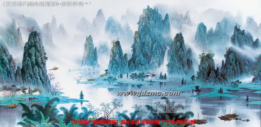 真正使得余晨洲艺术人生发生变化的,应该是第一次为景德镇壁画厂画大型瓷板画。那时余晨洲在赛跑坦卖瓷板已经很多年了,市壁画厂当时与客商签订了一笔大型壁画业务,题材是画庐山匡庐盛景的。最初聘请了一对著名的聋哑画家夫妇去画了,但当时任厂长的刘金泉老师不满意全部作废了。后来又请了另外一位老师设计制作,但是艺术总监王锡良老师又不满意。最后,他们决定让余晨洲依着设计稿去试画。结果余晨洲画的《匡庐盛景》征服了当时在壁画厂的所有专家教授。这幅《匡庐盛景》是整个庐山的全景式构图,余晨洲笔下的庐山青峰秀峦巍峨挺拔、银泉飞瀑喷雪鸣雷、云海奇观瞬息万变,一展庐山的无穷魅力,险峻与柔丽相济,大山、大江、大湖浑然一体。这是余晨洲人生中第一幅超大型瓷板画,总共花了三千多块瓷面砖,得到当时王锡良老师、白海老师、裴足喜老师等老一辈艺术家的一致赞赏。