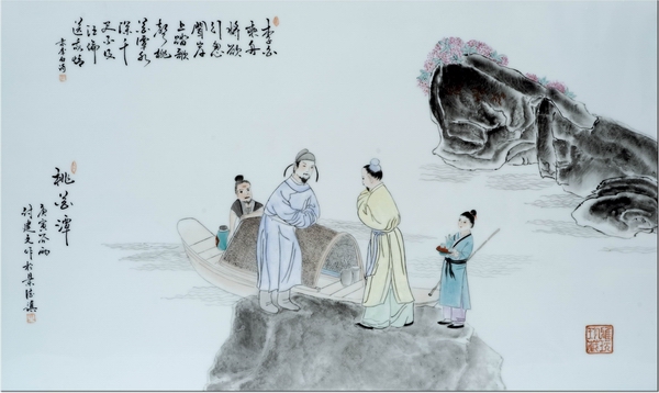 在大尺幅的《山居秋暝》意境画的创作中,处处有“王氏”的印记:山石、松树、人物,极富个性的陶瓷语言令人一见难忘,辨识度很高。在理解《山居秋暝》的意境时,傅建文辗转于瓷板之前沉思,在这幅画中,他将树景占据画面的主要篇幅,而一组组人物仅穿插其间,但人物却巧妙地成为了散布的视觉中心。仔细看,你会发现,他们或调弦弄琴,或斟酒吟诗,山林野趣,好不醉人。这是王维的故事,也是傅建文理解的王维的故事。世人曾赞“摩诘诗中有画,画中有诗”,傅建文正是细心揣摩了王维诗中的画面,通过一组组或近或远,或高或低的人物描绘,而画出了他心中的随意与自在。