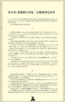 陶瓷专业技术人才多是景德镇的一种巨大财富。张守智说,景德镇有陶瓷股份公司这样的大企业,有原来十大瓷厂的管理基础。近年来,景德镇加大招商引资力度,引进了大量国内著名企业落户。这些企业经过在市场上多年的打拼,很多现在已是世界知名的品牌了,为景德镇把中国陶瓷从产量大国转向质量大国起好了步。这些都是非常宝贵的。在这种可喜的形势下,景德镇如果能将陶瓷专业技术人才多这—巨大财富发挥好,发展生活用瓷绝对是最具实力的,是最有后劲的,生产的瓷器绝对是世界最好的,一定能够领先整个中国陶瓷行业。“