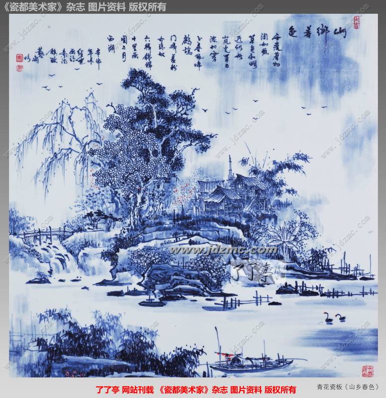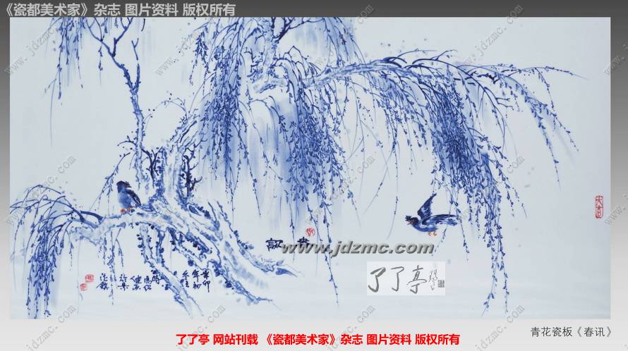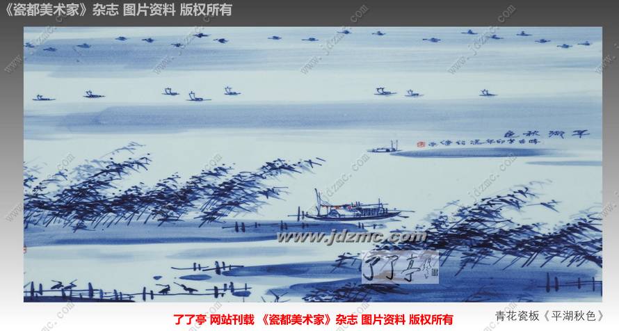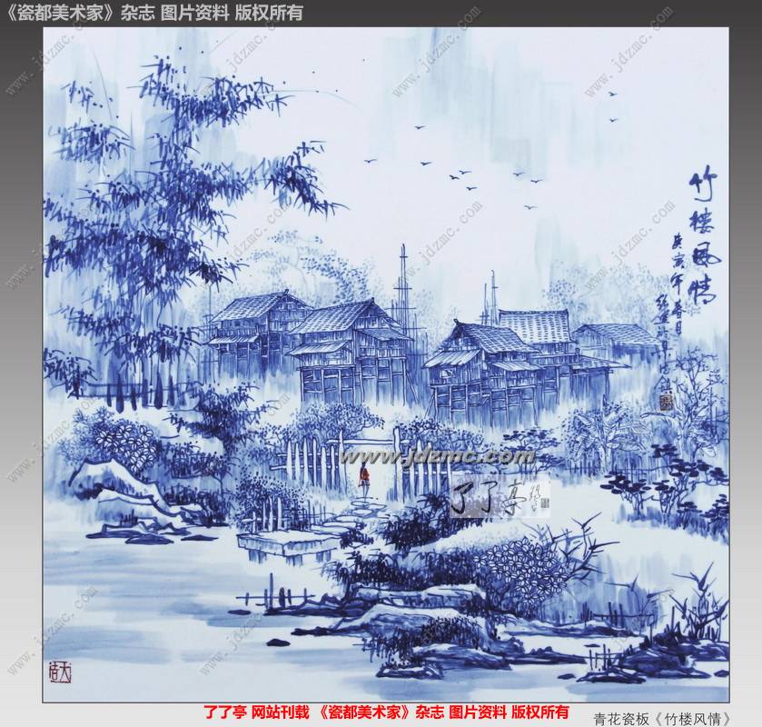 在他的作品中显现出用墨清润、画风洒脱、格调秀逸,笃实处见质感,虚略处显厚重,空疏里透辽阔,满密中现丰富,动静相宜,对比强烈,具有一种内劲外秀、刚柔相济、动静结合、雄浑潇洒、清秀含蓄的内涵,呈现出一派形式美感。这种意境清冷、用墨浓厚、张力十足的美感正是审美意识和修养的具体表现,是直接影响作品素质的极为重要的关键。画面层次清晰、运笔自然,富有水墨画的韵味,清秀隽永,充满柔静之美;笔触浓重厚实,自由灵动;线条虚实相间,柔美细腻。这种由景而发、由情而发之作,使得作品的“画外之音”与“诗情画意”油然而生,形成了清新朴茂的陶瓷艺术风格。作品《竹楼风情》中,晚霞渐渐被坝子中的绿色溶尽,高大的香蕉树叶姗姗地托起皓月,葱茏的凤尾竹林枝繁影斜,竹楼前青春纤细的少女,用纤纤细丝绊惹春风,令人联想到情意绵长的歌声,伴和着唧唧虫鸣,随晚风飘得很远很远,洋溢着浓郁的乡土气息。“小家碧玉”的旖旎风情,柔婉歌声的悠然恬美,撩起观者对云贵高原那独特风情的热爱,惊叹不己。