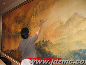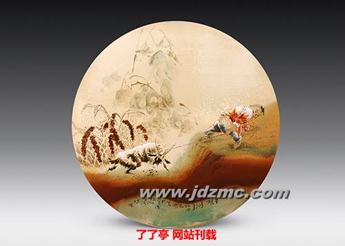 二、山水系列。评判一幅山水画的优劣高下首先要看其有无气象。什么是气象呢?所谓气象、气者、势也;象者,景也。山水画所谓的气象,是指山水画给人的总体观感和视觉印象。王品刚创作的山水题材作品有气象,有大的气势。比如,瓷板画《高山流水诗千首》、《牧童歌声山水间》、《渔家晚唱》等,气象万千,气韵生动。作品在工艺上有很大的突破,采用泼墨的技法,产生国画水墨的感觉。作者开始有个大概的布局,根据泼墨流动的状况,再逐渐完善,十分写意,也十分随意。这些作品表现了祖国山河的壮美。