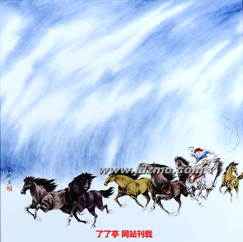 瓷板画《欢乐草原》也是王品刚的一件代表作。这件作品采用粉彩和青花相结合的技法,来表现草原上欢乐的情景。作品中大面积的蓝天白云,是用青花的笔画上去,晴空万里,十分漂亮。七匹昂首奋蹄的骏马,形态各异,飘逸灵动,十分壮观。这件作品虽然没有画草,但让你感觉到七匹骏马就是在广阔的草原上奔腾。这件作品给人以生机、力量和欢乐,表现了令人振奋的积极精神。王品刚也为这件作品写了一首诗: